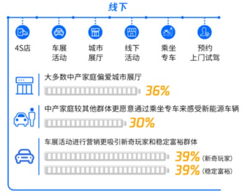 新能源汽车作为互联网大环境下的新生事物,通过互联网媒体与消费者建立连接也成为了新能源汽车营销的关键手段。报告数据显示,在营销触点上,社交平台、专业的网络媒体和新线下营销模式将成为新能源汽车被消费者关注的重要渠道。当然,不仅限于新能源汽车,目前广大80、90后主力消费群在新能源汽车购买决策上,几乎都会参考专业的汽车论坛或知名社会媒体的报道。微信则凭借其强大的社交基因,也成为获取品牌、产品口碑的重要渠道,是影响消费者购买决策的突破口。在线下部分,4S店仍被多数消费者群体所青睐。毕竟在网络上了解后,消费者需要前往实体店看车、试车,以做出最终抉择。