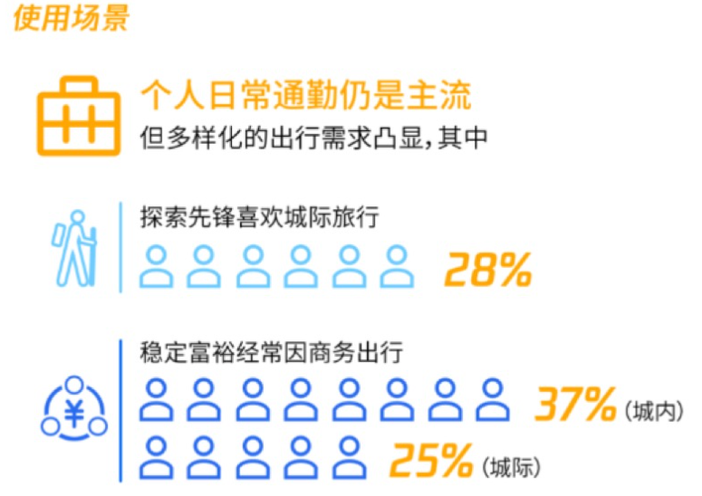 基于消费者的社会属性、消费观和生活方式,报告认为:中产家庭,探索先锋,稳定富裕和新奇玩家将成为新能源汽车的主力消费群体。而通勤、家庭出行、城际旅行、商务出行仍是上述人群使用新能源汽车的主要场景。其中通勤的占比明显高于其他使用场景,这与目前一二线城市上下班高峰繁重的交通压力下,新能源汽车能源成本更低有很大关系。